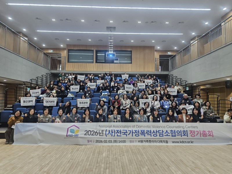 2026년 전국가정폭력상담소협의회 정기총회 참석(26.02.03) 페이지 정보 작성자 최고관리자 작성일26-02-06 15:32 조회98회 관련링크 다음글 목록 본문 1.일시:2026년 02월 03일 화요일 오후2tl2.장소:서울가족플라자 다목적홀3.안건:25년 사업보고 및 결산 공로상 전달 및 9기 임원 인준 26년 사업계획 및 예산승인 등 다음글 목록