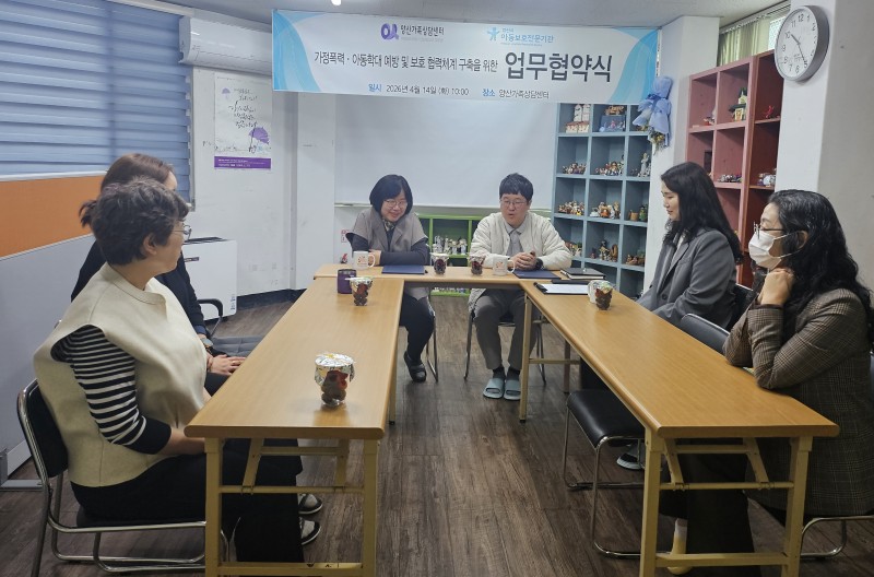 양산시 아동보호전문기관 업무협약식(26.04.14) 페이지 정보 작성자 최고관리자 작성일26-04-17 15:04 조회9회 관련링크 이전글 다음글 목록 본문 1. 일시 : 2026년 04월 14일(화) 오전 10시2. 장소 : 양산가족상담센터 내3. 내용 : 가정폭력 피해자 및 학대 피해아동 보호를 위한 협력체계 구축을 위한 업무협약식 및 간담회 이전글 다음글 목록