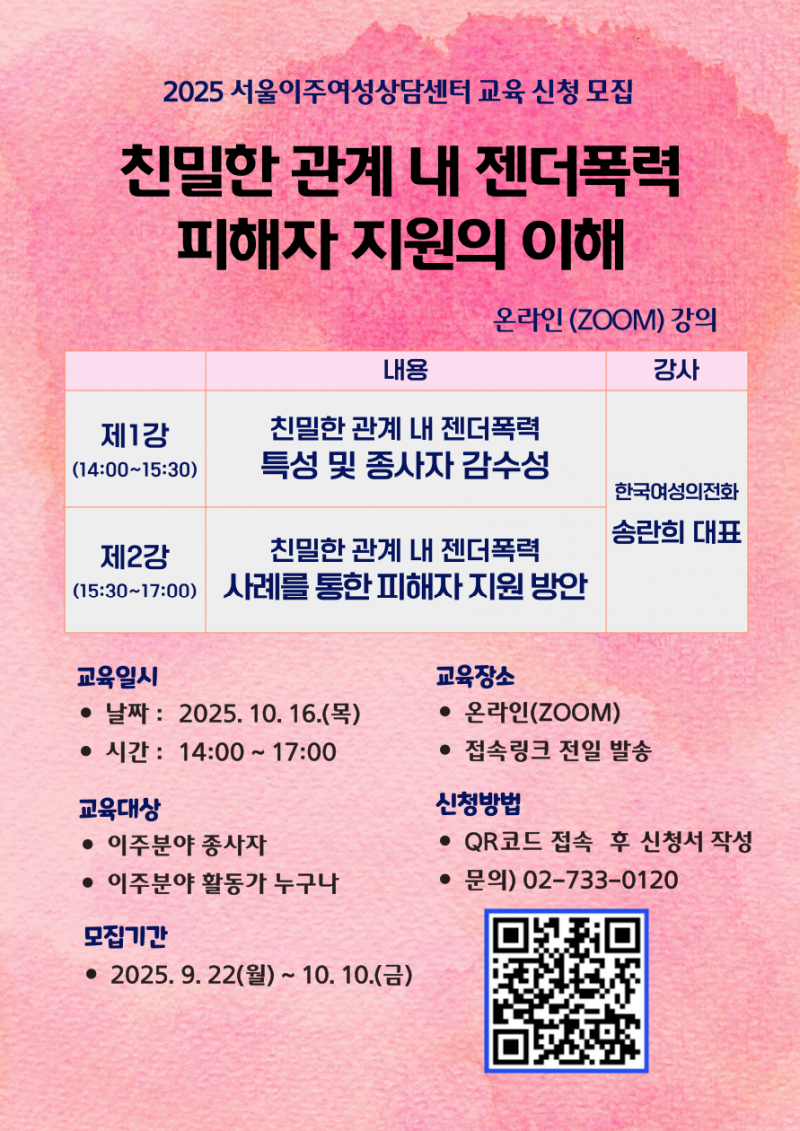 2025 서울이주여성상담센터 - 친밀한 관계 내 젠더폭력 피해자 지원의 이해 교육 참여(25.10.16) 페이지 정보 작성자 최고관리자 작성일25-10-20 16:46 조회15회 관련링크 이전글 다음글 목록 본문 1. 일시:2025년 10월 16일 오후2시 ZOOM 교육2. 내용:친밀한 관계 내 젠더폭력 특성, 종사자 감수성, 사례를 통한 피해자 지원 방안 이전글 다음글 목록