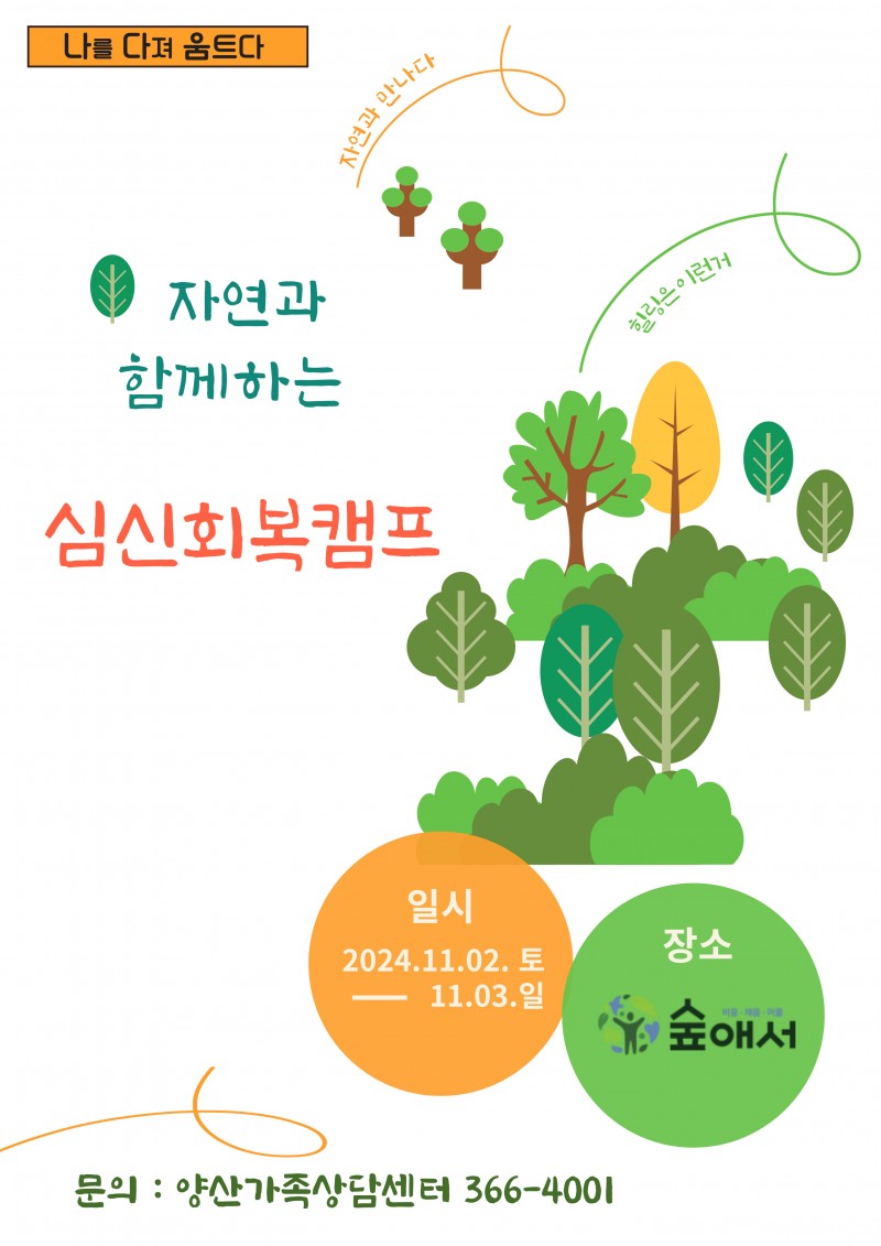 자연과 함께하는 심신회복캠프 참가자모집 페이지 정보 작성자 최고관리자 작성일24-10-15 15:42 조회960회 관련링크 이전글 다음글 목록 본문 - 모집기간 : 2024년 10월 25일(금)까지 - 대 상 : 폭력피해로부터 심리적 안정과 심신회복이 필요한 ○○명 (선착순 모집)- 참 가 비 : 무료- 기타문의 : 366-4001 ※ 본 사업은 2024년 양산시지방보조금 지원사업입니다. 이전글 다음글 목록