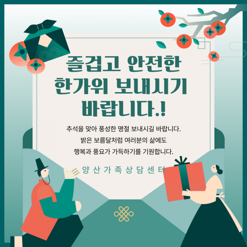 즐겁고 안전한 추석연휴 되시길 바랍니다. 페이지 정보 작성자 최고관리자 작성일25-10-01 10:32 조회376회 관련링크 이전글 다음글 목록 본문 즐겁고 안전한 추석연휴가 되시길 바라며 연휴동안 휴관하오니 이용에 차질이 없으시길 바랍니다.긴급전화는 1366에서 지원합니다.감사합니다. 이전글 다음글 목록