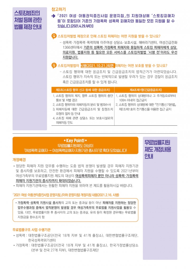 이슈브리프 'ON' 1호 (2021년 변화하는 여성폭력 관련 법제도 확인하기 편) 페이지 정보 작성자 최고관리자 작성일21-05-24 15:37 조회808회 관련링크 이전글 다음글 목록 본문 ● 출처 : 한국여성인권진흥원(2021), 「2021년 변화하는 여성폭력 관련법 제도 확인하기」 이전글 다음글 목록