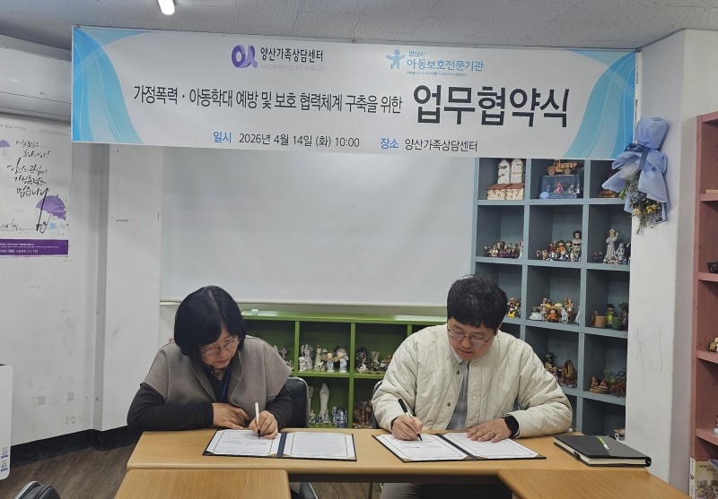 양산시 아동보호전문기관 업무협약식(26.04.14) 페이지 정보 작성자 최고관리자 작성일26-04-17 15:04 조회54회 관련링크 이전글 다음글 목록 본문 1. 일시 : 2026년 04월 14일(화) 오전 10시2. 장소 : 양산가족상담센터 내3. 내용 : 가정폭력 피해자 및 학대 피해아동 보호를 위한 협력체계 구축을 위한 업무협약식 및 간담회 이전글 다음글 목록