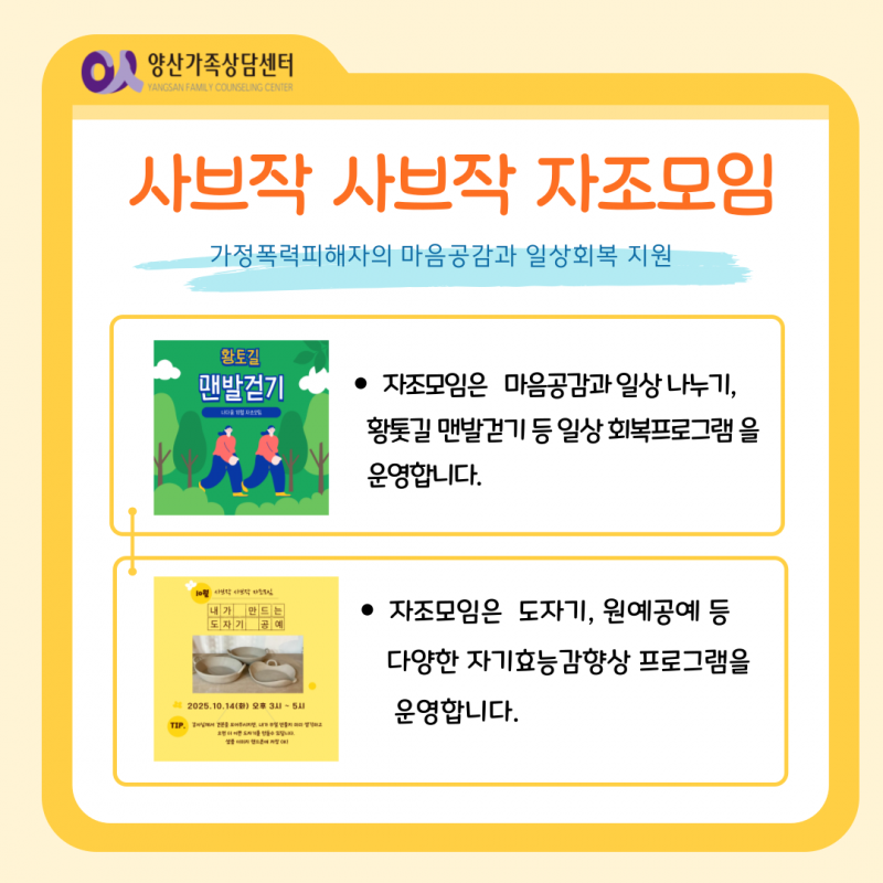 '사브작 사브작' 자조모임(25.11.18) 페이지 정보 작성자 최고관리자 작성일25-11-19 14:23 조회66회 관련링크 다음글 목록 본문 1.일시:2025년 11월 18일 (화) 15시2.장소:양산가족상담센터 내 교육장 다음글 목록