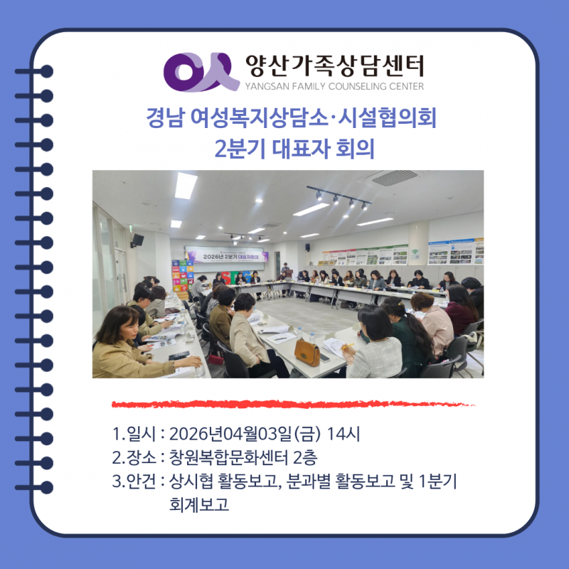 2026년 경남 여성복지상담소·시설협의회 2분기 대표자 회의(26.04.03) 페이지 정보 작성자 최고관리자 작성일26-04-07 10:51 조회45회 관련링크 다음글 목록 본문 다음글 목록