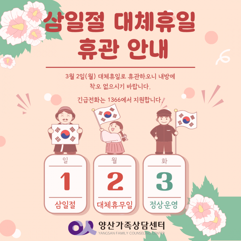 삼일절 대체휴무 휴관 안내 페이지 정보 작성자 최고관리자 작성일26-02-27 15:22 조회36회 관련링크 다음글 목록 본문 3월 2일(월)은 삼일절 대체휴무일로 휴관하오니 내방에 착오 없으시기 바랍니다.긴급전화는 1366에서 지원합니다.감사합니다. 다음글 목록